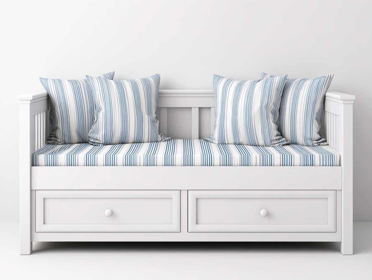 Rivestimento in tessuto nei colori blu e bianco, con superficie resistente e piacevole al tatto. Struttura solida progettata per un utilizzo quotidiano.
